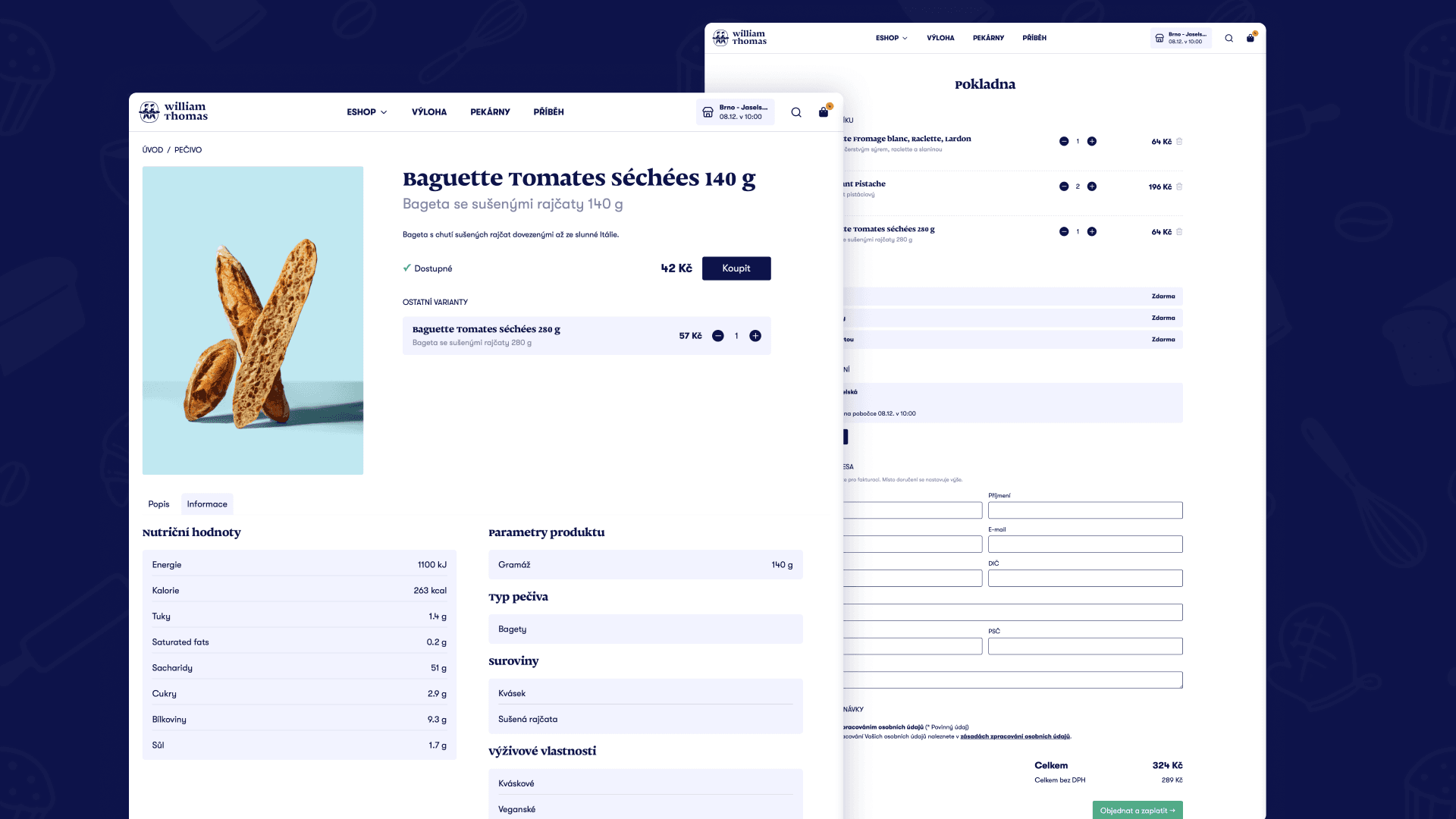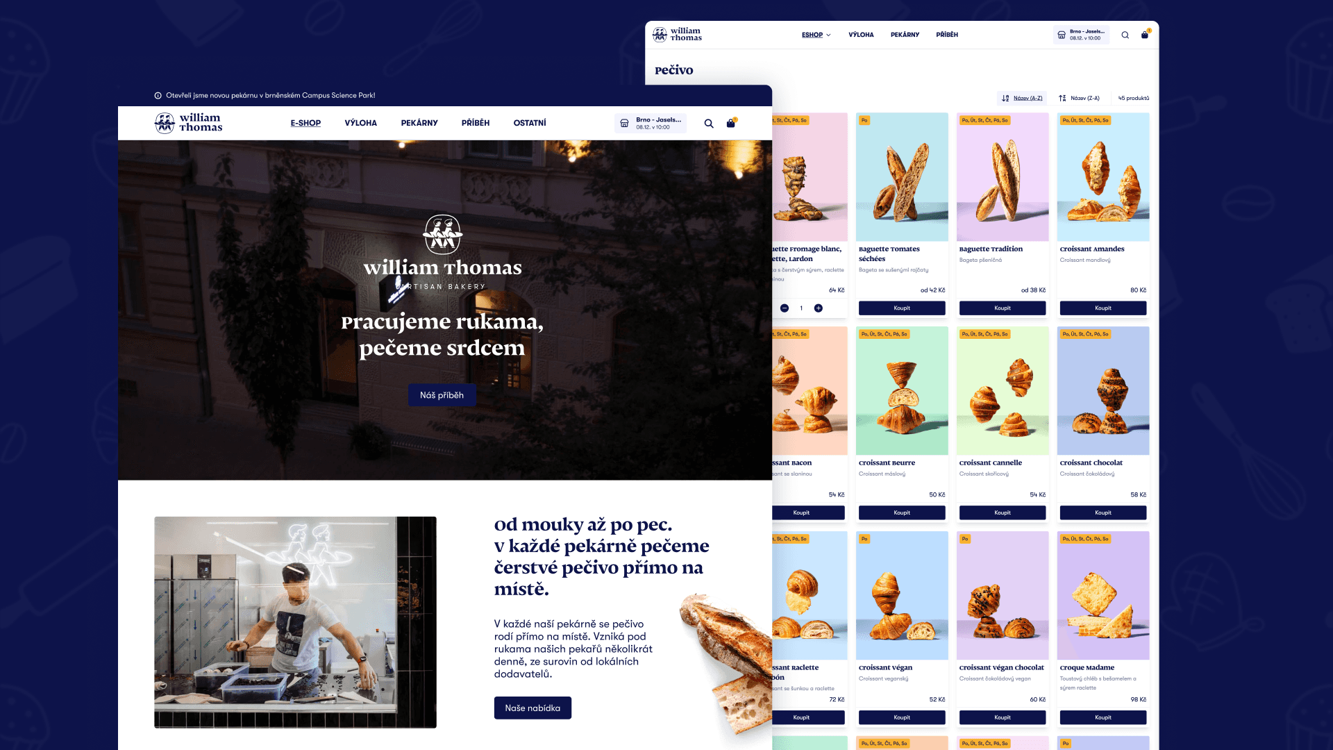 Finální design je postaven na čistém, moderním rozhraní s jemnými pastelovými barvami, které podtrhují řemeslný charakter pekárny. Struktura webu je navržena tak, aby se uživatelé mohli pohybovat přirozeně a intuitivně — podobně, jako by procházeli skutečnou pekárnou. Součástí řešení je například stránka „Výloha“, která uživatele nenutí k okamžitému nákupu, ale umožňuje jim nerušeně procházet celou nabídku produktů William & Thomas Bakery.
